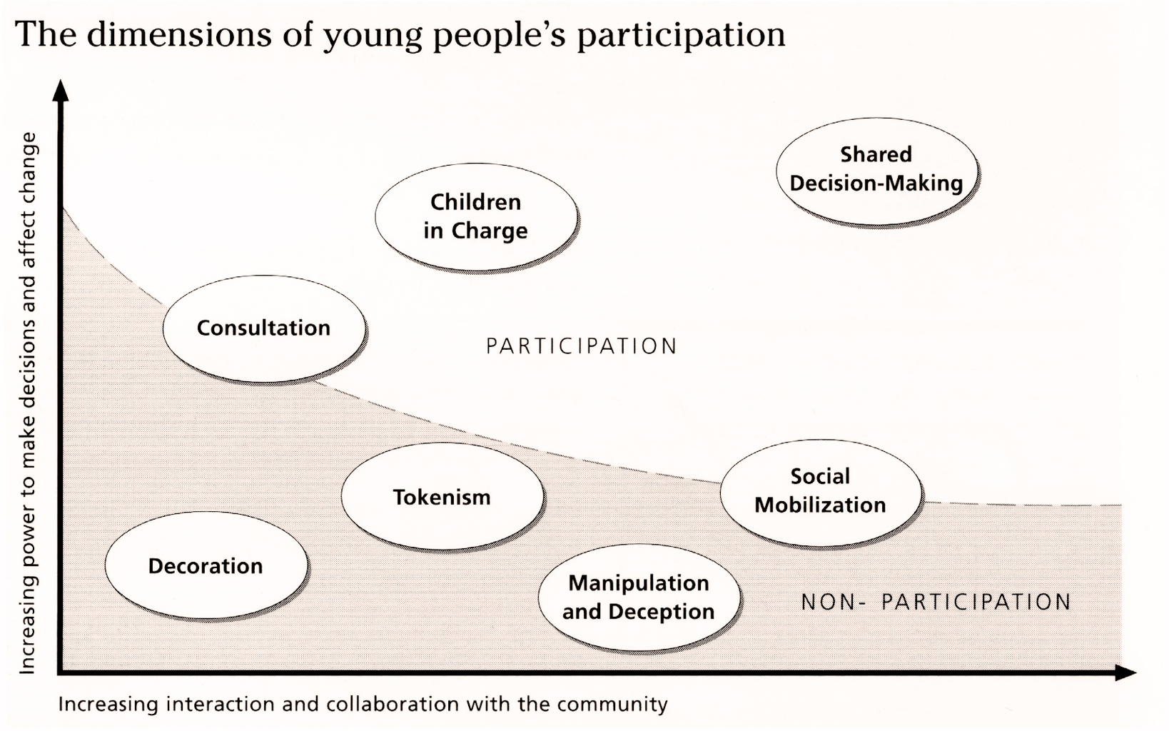 In Creating Better Cities with Children and Youth: A Manual for Participation (2001), David Driskell proposed another reconceptualization of Roger Hart’s Ladder of Children’s Participation called the Dimensions of Young People’s Participation. The reconceived presentation places the eight rungs of Hart’s Ladder on an X-Y axis. The vertical dimension illustrates increasing power to make decisions and change, while the horizontal dimension illustrates increasing levels of interaction and collaboration. Image source: Creating Better Cities with Children and Youth: A Manual for Participation.