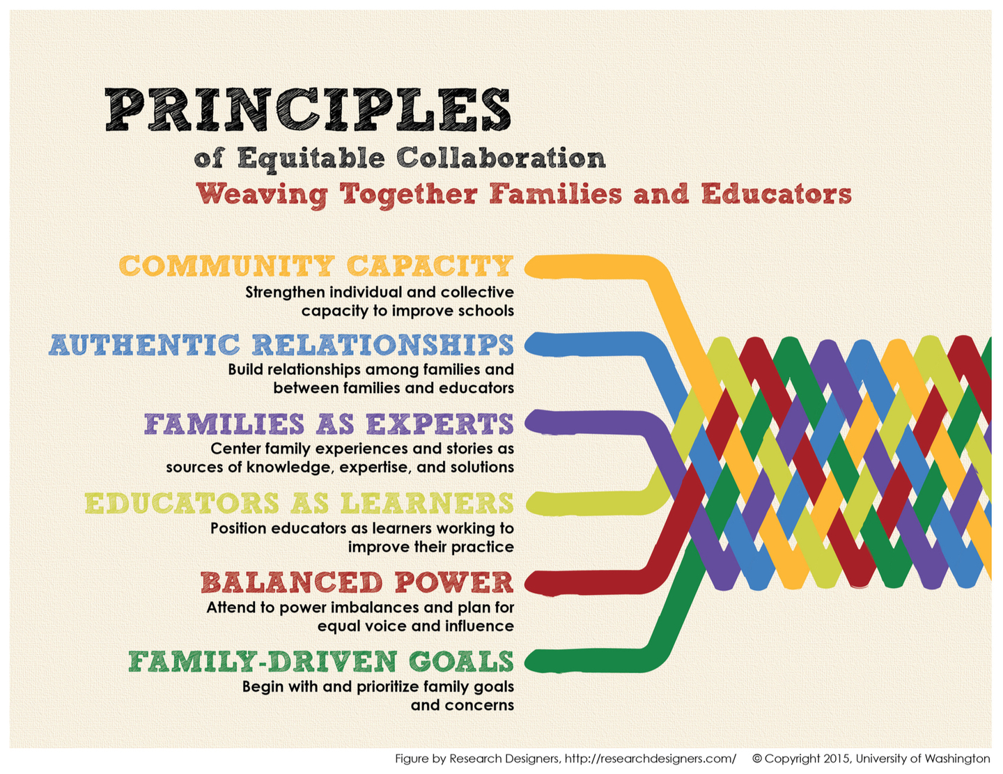 The Equitable Collaboration Framework was developed by the Equitable Parent-School Collaboration Research Project at the University of Washington’s College of Education. The project’s research team seeks to understand and support parent-engagement programs that promote equitable educational outcomes for underserved students, families, and communities.