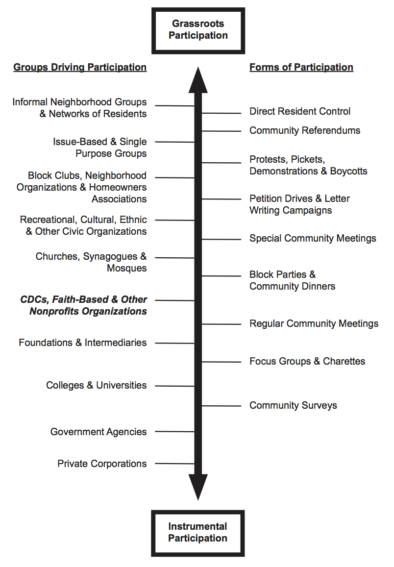 As Silverman explains, “Formal societal-level organizations such as private corporations and government agencies are associated with instrumental participation, although informal parochial-level organizations such as block clubs and informal neighborhood groups are associated with grassroots participation. In addition to predicting which types of organizations would be located at the extremes of the continuum, this framework predicts that organizations like CDCs would fall in an intermediate position along the continuum. In other words, community-based organizations and other nonprofits are predicted to face conflicting pressures to balance the necessity of using instrumental forms of citizen participation against demands for greater grassroots participation.”