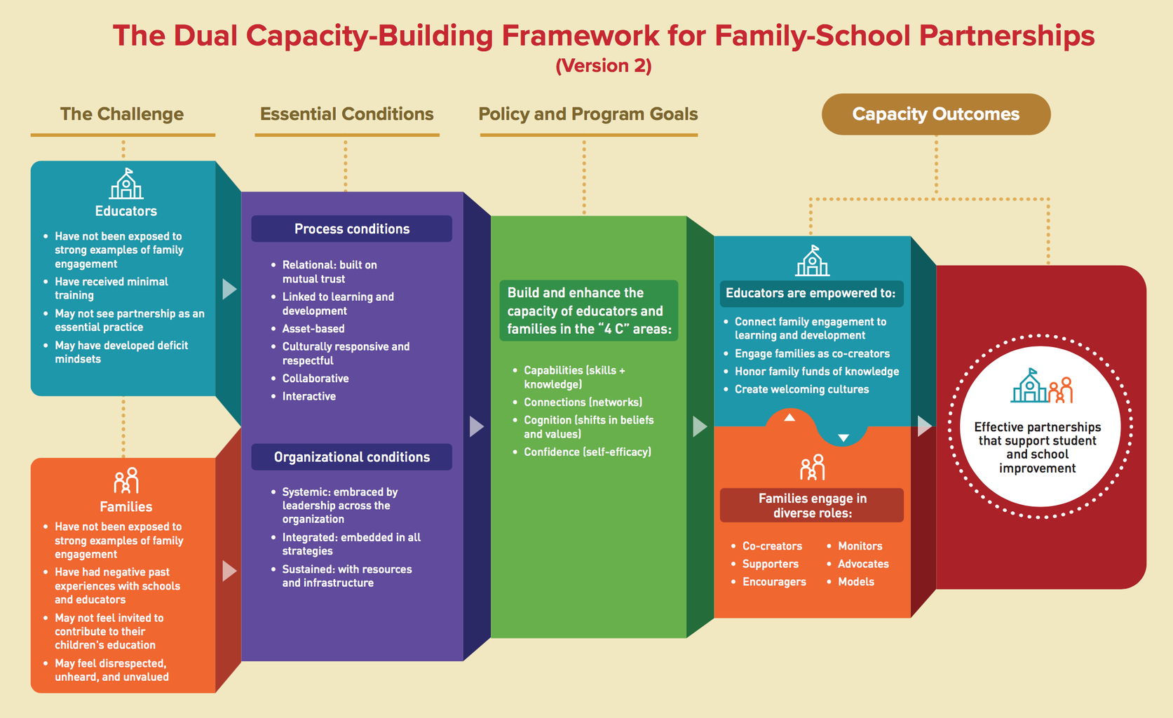 Developed by Karen Mapp, the original version of the Dual Capacity-Building Framework for Family-School Partnerships was published in 2013 and quickly became one of the most influential models in the field of youth, family, and community engagement in education. While Version 2 features several substantive changes to the model and a redesigned graphic, the four foundational components of the original model—describing challenges, conditions, goals, and outcomes—remain in the new version released in 2019. Source: Partners in Education: A Dual Capacity-Building Framework for Family-School Partnerships