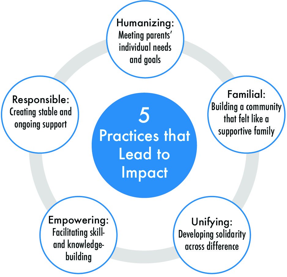 In 2019, the Parent Leadership Indicators Project released The Ripple Effect in Action: What 7 Parent Leadership Initiatives Learned from Participatory Evaluation, which summarizes a technical evaluation report on the national Parent Leadership Evaluation Network coordinated by the Parent Leadership Indicators Project and its partners. The summary describes five practices that participatory evaluators determined to be common elements effective parent leadership organizations and programs: